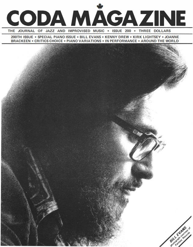 I am in the process of expanding and revising my Bill Evans Reader and I hope to have this new edition ready by the end of 2026. Among the many “new finds” that I plan to include in the enlarged edition is this piece by Ted O’Reilly which was published in the February 1985 edition of CODA, a Canadian Jazz magazine that ceased publication in 2009.